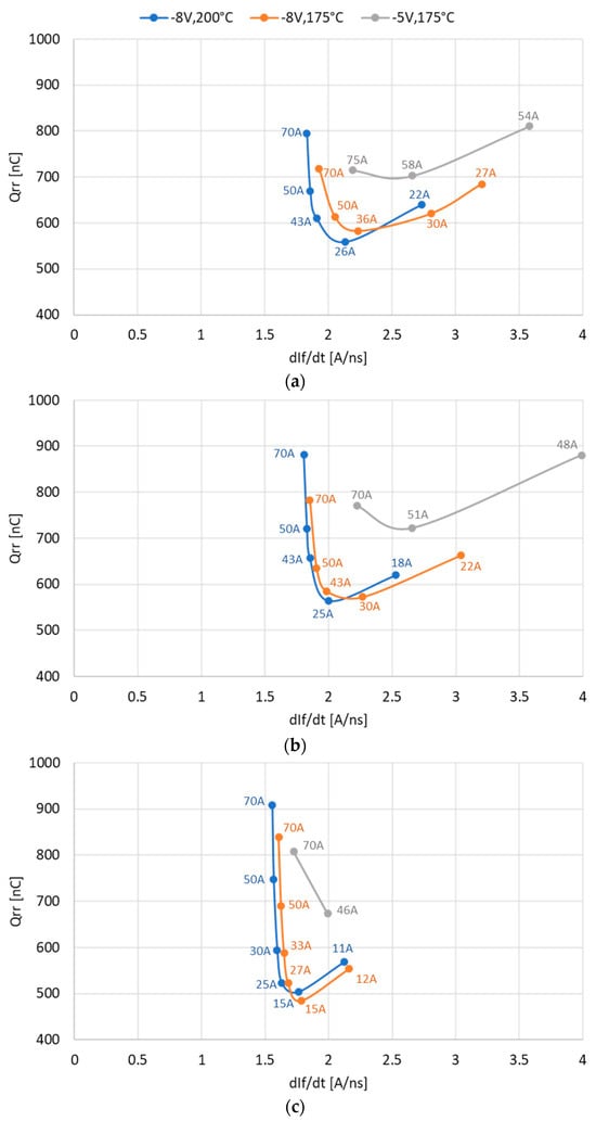 In the analysis reported in Figure 19 and Figure 21, Qrr varies as a function of the forward current and dif/dt. There is a “valley” in the Qrr curves because Qrr decreases as the current decreases, while it increases as dif/dt increases, and the snappy condition occurs at high dif/dt and low current. More specifically, at low current, a further current reduction requires a very large increment in dif/dt to obtain snappy conditions, thus the effect of the latter is prevalent, showing an increment in Qrr, and consequently there is a “valley” in the curve. For example, in Figure 19a, at VG_L = −5 V/Tc = 175 °C (grey curve), to obtain the snappy condition passing from a current of 58 A to 54 A, it is necessary to increase the dif/dt by about 40%. Therefore, the reduction in the current (−6.9%) is smaller than the dif/dt increment, thus the overall effect is a Qrr increment, accounting for the “valley”.