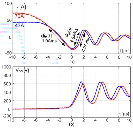 Figure 20 highlights the current and the Vds voltage of the typical device at VG_L = −8 V, Tj = 200 °C and two different conditions of forward current (43 A and 70 A), as already shown in Figure 19b. Both cases are snappy limit cases and, although they have different values of current, they have almost the same dif/dt. This analysis has highlighted the presence of a (dif/dt)min below which the recovery is not snappy, even for a high current level. Moreover, once (dif/dt)min is reached, Qrr depends only on If. It must be noted that this behavior is true in the case of VG_L = −8 V and Tc equal to 175 °C and 200 °C. In the case of VG_L = −5 V and Tc = 175 °C, the trend is quite different, since very high current and dif/dt are needed, so the condition of a (dif/dt)min is not reached. This limit is lower when the temperature (Figure 19) and the Vth (Figure 21) of the device are higher.