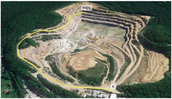 Figure 2), revealing the indicated section of the main haul road. The longitudinal road profile obtained was 1850 m in length from level 370 and the loading station right through to the stationary processing plant designated by K in