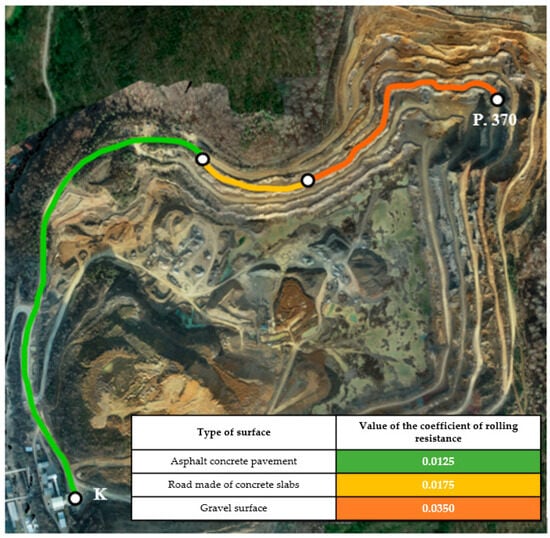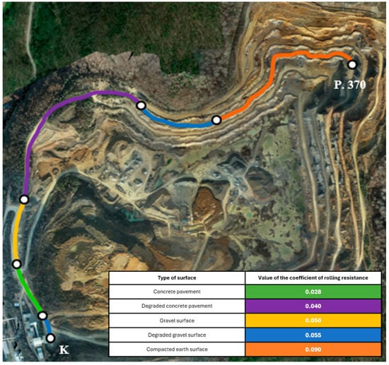 Mine sections with different road surface types are highlighted with colors, and the corresponding coefficients of rolling resistance are given in the lower right corner (