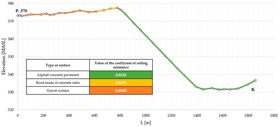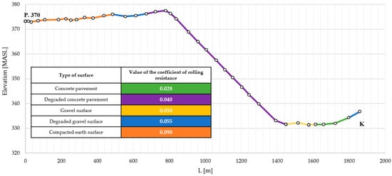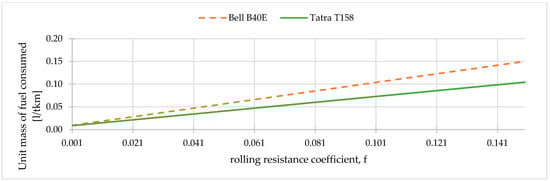 Figure 6), the larger the magnitude of the grade resistance. In order to maintain the constant speed during the ride, the driver has to increase the driving power, which results in an increase in the energy input required to perform the haulage work and, consequently, of the unit mass of consumed fuel. A similar pattern is observed for the rolling resistance