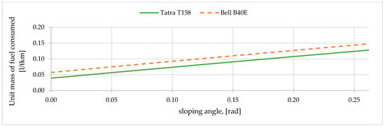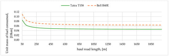 Figure 7), showing that in order to reduce the energy consumption of the mine trucks, it is recommended that haulage roads should be designed and constructed with the best possible road surface, made of long, gently sloping road segments (instead of short, steep ones). Differences in the values of unit energy consumption and unit mass of fuel consumed for the analyzed trucks are attributable to differences in their technical parameters, such as the powertrain efficiency and the truck’s ratio of empty weight to payload capacity.