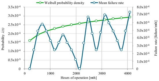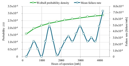 In order to reconstruct the real operating conditions of machines over longer periods, the operating times of the road transport system (haulers and articulated trucks) were examined, and failure processes were highlighted. The reliability analysis of the vehicle fleet was conducted over a one-year timeframe, assuming a total of 4 thousand operating hours. This analysis was based on the failure rate of the truck fleet, accounting for the cumulative operation time. Studies of failure processes relied on the generated distribution patterns best fitting the data yielded by the reliability analysis, specifically the Weibull probability density function (see