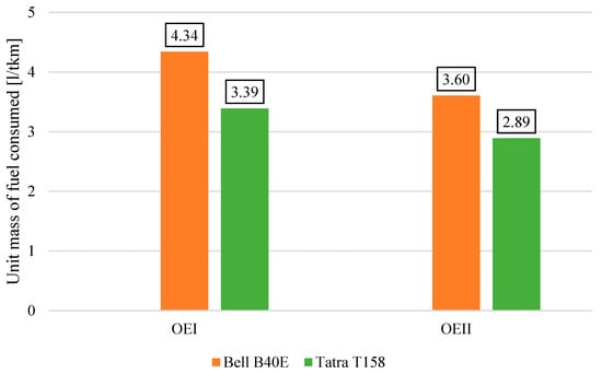 The comparison of two variants of the mining operation conditions (OE I and OE II) reveals that modification of the haul road surface will result in a significant reduction in fuel consumption. The difference between mjp values registered in variant OE I and OE II amounts to 16.96% for the Bell B40E trucks and 14.75% for Tatra T158 vehicles, and more favorable values are obtained for the modified road surface.