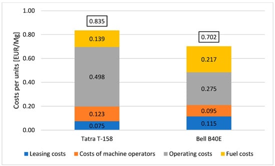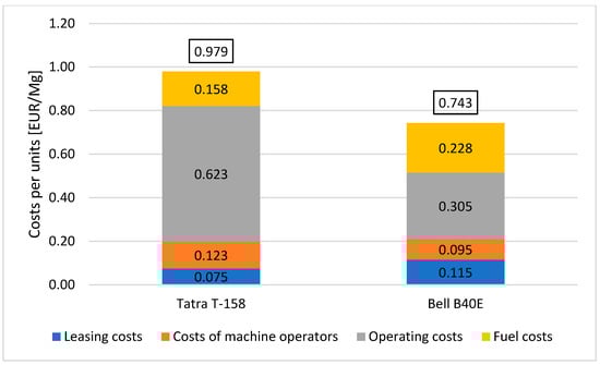Assuming an increase in reliability and availability of 10% for the Bell B40E and 20% for the Tatra T-158, and despite the significant difference in fuel consumption between the trucks, the Bell B40E has a lower unit cost (EUR/Mg). For the Tatra T-158, a change in the operating environment can reduce unit costs by 15.5% (EUR 0.15/Mg), while for the Bell B40E it can reduce unit costs by 8.6% (EUR 0.06/Mg). However, as the change in operating environment is more significant for the Tatra T-158 than for the Bell B40E, the Bell B40E trucks will be more economically advantageous and their design assumptions more favorable under real operating conditions.