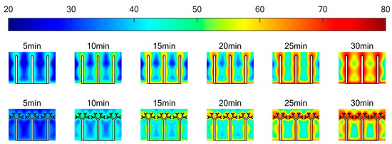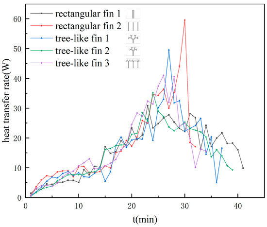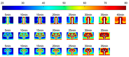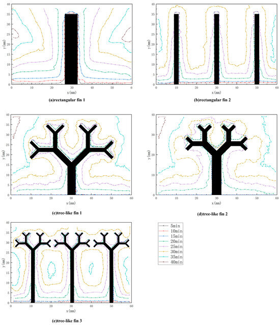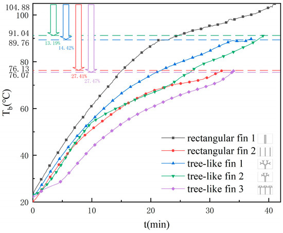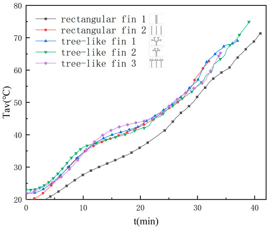 - The tree-like fins are beneficial to controlling the heating surface temperature. At the end of the melting process, the bottom surface temperatures of the two units with tree-like fins were 14.42% and 13.19% lower than that of the unit with rectangular fin 1. The branched structure facilitates the conduction of heat from point to surface, making the temperature distribution more uniform during the melting process.