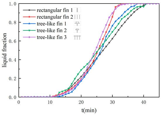 - The tree-like fins significantly improve the heating performance of LHTES. Among the one-fin units, compared with the rectangular fin, the full melting time of the unit with tree-like fin 1 is reduced by 9.76% because the improvement of the heat conduction of the tree-like fins is greater than the inhibition of natural convection.