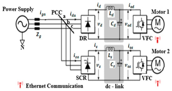 Figure 1 shows a typical Nestle plant VSD connection of two electric motors. Most of the three-phase VSDs employ six-pulse-bridge “uncontrollable” diode rectifiers or “half-controllable” silicon-controlled rectifiers (SCRs) that are used to convert AC power to DC power that is used by variable frequency converters (VFCs). These circuits are low in cost, simple, and highly reliable. However, the conversion process produces significant harmonic currents that trigger system resonance at (Figure 1), which causes relatively high-voltage harmonics across the point of common coupling (PCC). All these phenomena pollute the power supply, leading to poor power quality. LC passive filters (de-tuned filter banks and fine-tuned filters) are used to address harmonics issues. Other measures include active filtering, inductive reactance, and high-pulse rectifiers. Nevertheless, filters are not quite cost-effective for dealing with these issues. In some instances, differential mode (DM) and common ode (CM) noise like electromagnetic interference (EM) filters are added to the filter circuit (Figure 1), but this increases the risk of resonance in a multi-drive system, like the one at the Nestle Chocolate factory in East London, Eastern Cape Province of South Africa.