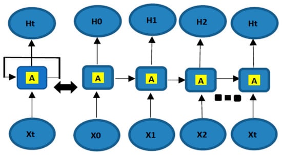 A deep neural network (DNN) is a developed and advanced artificial neural network (ANN) that is sequence-based and has the capability of learning and extracting features from inputs in the time series domain. RNN is a recurring neural network and has a unique network architecture, as shown in Figure 2. to represent the input variables, while to represent the output variables. A variable is a symbolic representation that can assume various values, categorized based on characteristics and context into types like independent, dependent, discrete, continuous, and categorical.