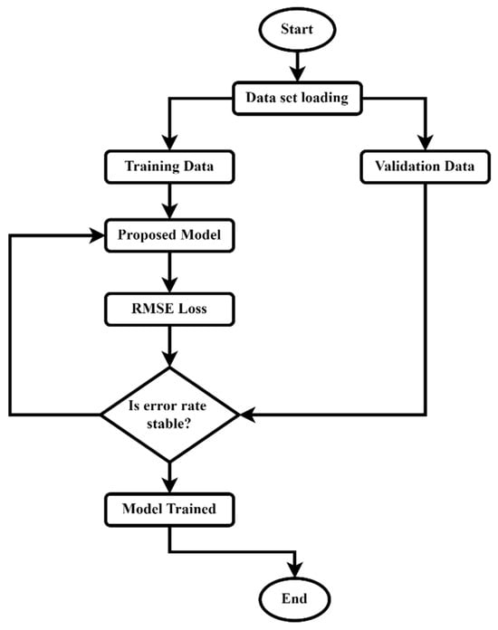 The aim is to build a DL machine model that can forecast the production of harmonics, thereby reducing the risk of machine breakdown. Supervised learning typically requires iterations of building and evaluating different models. Figure 4 shows the proposed model flowchart. The data are initially split into training and validation data. The model root mean square error (RMSE) loss is checked whether it is stable. If the RMSE error rate is not stable, the model will retrain; otherwise, the model will be validated, and the training ends. Once the model is trained, its performance is typically evaluated by comparing model predictions with known responses.