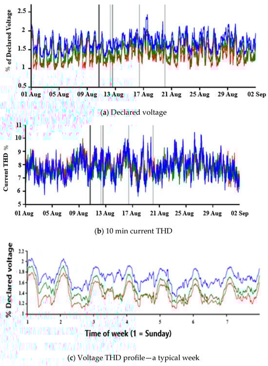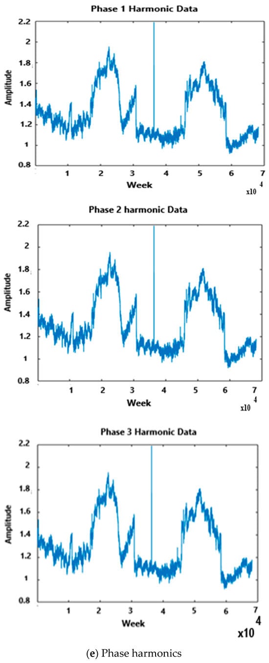 The factory uses both variable frequency drives (VFDs) and variable speed drives (VSDs) for the speed control of DC and AC motors and variable source inverters (VSI) in uninterruptible power supplies (UPS) units. Modern VSDs use pulse-width modulation voltage source inverters (PWM VSIs) to control the speed of three-phase induction motors. The advantages of PWD VSI are extremely good dynamics, peak current protection, instantaneous current waveform control, better accuracy, compensation of load parameter changes effect, semiconductor voltage drop compensation, and dc link and ac side voltage changes compensation. VSDs and VFDs have numerous advantages, including the following: matching motor and load characteristics; energy-saving speed; and position control; the reduction of stresses as well as transients caused by ON/OFF; and sudden motion operations. VSDs may significantly decrease the quality of the alternating current (AC) to which they are connected, and they draw non-sinusoidal current from the main power AC supply, thus leading to the generation of high-order harmonics in the power supply. These harmonics are reduced by direct current (DC) chokes to maintain levels below the International Electro-technical Commission (IEC) 62,635 maximum standard measured total harmonics distortion (THD) index. The sample THD data that was used in this paper are shown in Figure 5a–e. The declared voltage represented a sample of the supply voltage, alongside current total harmonic distortion (THD), a typical three-phase voltage THD profile for a typical week measured at the plant, harmonic order data of the measured harmonics at the plant, and phase harmonic information. Figure 5e depicted the simulation results of harmonic data in MATLAB, aiming to gauge how closely the simulation aligned with the actual harmonics measured at the plant. The objective is to accurately manage the active filter’s reaction time delays and response using the proposed DL method. The filters are designed and used by manufacturing factories with non-linear and stochastic loads, like Nestle in East London. The Nestle confectionery plant emerged as one of the top five contributors to harmonics in the Buffalo City Municipality electrical distribution network. Nestle proactively supplied the requisite data, whereas the other four plants declined participation without clarification. The study specifically delved into utilizing AI techniques to forecast harmonics within the load-side subsystem of the electrical power system, mirroring earlier research that explored AI techniques for predicting harmonics in the generation and transmission subsystems.