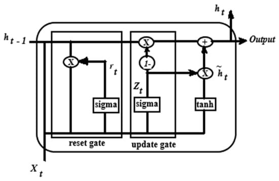 The input is ; the reset gate is ; , is hidden layer state output at the current and previous time; the update gate is ; tanh is an activation function; is a sigmoid function; and is the active state of a hidden layer at the present time. The GRU has been used in a hybrid model with AM in order to improve its performance [24]. GRU, short for “Gated Recurrent Unit,” represents a form of recurrent neural network (RNN) architecture. It serves as a modification of conventional RNNs and aims to tackle the challenge of the vanishing gradient problem encountered during the training of RNNs on lengthy sequences. GRUs integrate gating mechanisms that manage the information flow within the network, enhancing its capacity to comprehend dependencies across extended sequences. They find extensive application in natural language processing endeavors such as machine translation, text generation, and sentiment analysis, alongside various sequential data tasks like time series forecasting and speech recognition.