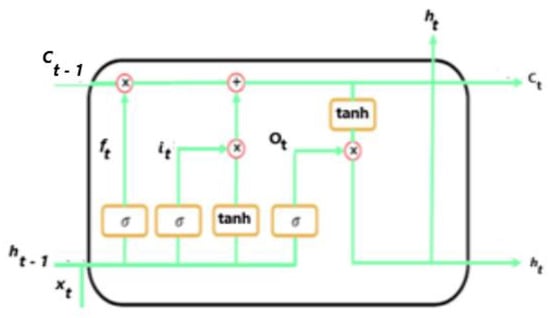 LSTM was developed based on GRU and was developed to deal with RNN limitations [25]. The LSTM model has memory cells that are used to remember long-term historical data, and Figure 7 shows the LSTM cell architecture. The data in an LSTM cell are regulated through three gate mechanisms, namely, the input gate , the forget gate , and the output gate . The input gate deals with the latest information that is fed into a cell by choosing which current information is maintained from the previous state; the forget gate regulates how much information must leave a cell and the output gate deals with how much information can leave the cell to the output. Memory plays a significant role in LSTM by enabling the network to selectively store and retrieve information over time. The start of the memory cell is performed through point-wise multiplication and sigmoid function operations. The input information at the current state, together with , forms the hidden state of the previous LSTM cell/layer and is fed into all the gates and transitioned by the sigmoid and tanh functions. A linear combination of the prior cell state and the current input is manipulated to update the cell when the gating mechanism is activated. The forget gate determines data that must be kept or rejected, and its output is anywhere between zero and one. If the forget output is leaning towards zero, then it means the information has been ignored, and if the information is close to one, then the data have been kept.