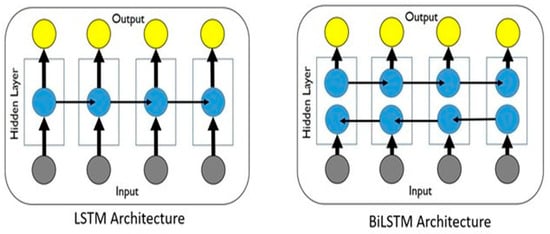 A single LSTM layer manipulates data in the forward direction. Bi-LSTM has two LSTM layers: one layer processes data in the onward direction and the other layer in the regressive direction, as shown in Figure 8. The LSTM layer in the forward direction receives the input past data information, and the reverse LSTM layer obtains the input sequences’ future information. Then, the output in both hidden layers is combined. The hidden state of Bi-LSTM at time t has forward and reverse and is expressed by the equation.