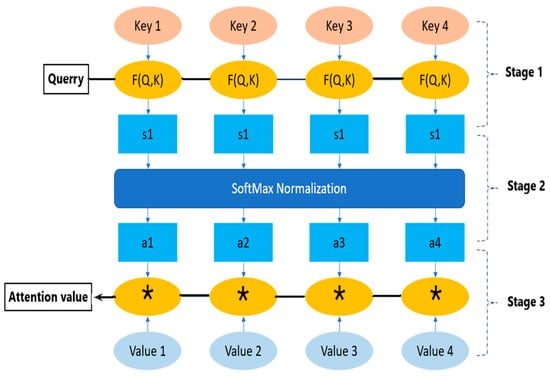 where is the attention score, is the weight, is the input vector, and is the bias. The score obtained in stage one is normalized, and SoftMax function is employed to convert the attention score using the mathematical expression at stage two.