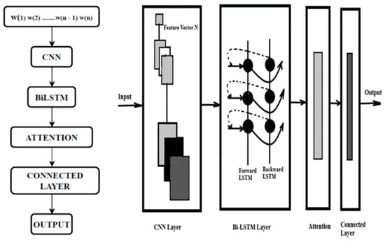 The AM process is based on weight allocation, determining key and valuable information through the distribution of higher weights. It has three stages and is usually used after the CNN and Bi-LSTM networks to place emphasis on characteristics that contribute to the desired output and model performance improvement. The attention function is a mapping from a query to a sequence of key values. The similarity between the query and each key is calculated in the first stage using the mathematical expression.