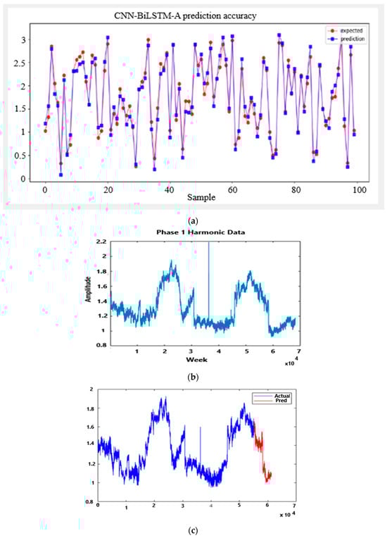 The introduction of the attention mechanism in the CNN-BiLSTM model, highlighted in this study, further enhances prediction accuracy, as depicted in Figure 14. Subplot (a) illustrates the close alignment between the blue prediction curve and the red expected curve. Subplot (b) displays harmonics data, and subplot (c) showcases the red prediction closely matching the expected data, emphasizing the superior accuracy of the model in predicting harmonics.