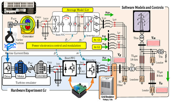 Ocean energy is currently seen as a promising source of energy for local power generation and microgrids. Viable options have been formulated for medium- and long-term solutions to electrify remote areas, creating economic growth opportunities to combat energy poverty [1,2]. Different technologies that are focused on the extraction of energy have been published in the state of the art. Ocean currents are the most promising renewable energy, due to their semi-permanent nature [3]. The efficiency of these devices depends on extensive multidisciplinary research and development. This includes measuring current velocities, designing turbines and their structural support, designing electrical generators and power electronic converters with their own regulations, and assessing the impact on the voltage stability of the electrical grid to determine compatibility and interconnection levels [4].