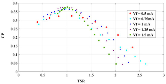 The power coefficient for the NACA0014 turbine, as presented in [26], was utilised in this study. The maximum value, depicted in Figure 3, was 38%. The circular tank used in the experiment had dimensions of 10.5 m × 3.2 m. The turbine had a diameter of 0.3 m, a blade chord length of 0.1 m, a height of 0.45 m, and a blade pitch angle of 43.63°. With a fluid velocity of 1.5 m/s, the obtained output value was 84 W.