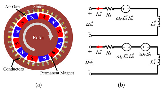 Assuming that the three-phase armature of the permanent magnet synchronous generator is symmetrically distributed, and that the mutual inductance is zero, the voltage is calculated as presented in (5) [27,28]. Core-generator saturation, eddy currents, and hysteresis losses are neglected.