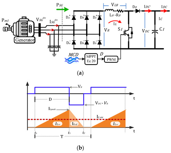 In this section, the alternating voltages obtained from the PMSG generator is converted to direct voltage () using a three-phase PFC boost converter consisting of an uncontrolled diode rectifier and a DC-DC boost converter with high frequency operation, as shown in Figure 6 The rectified voltage can be defined as the peak magnitude of the three-phase line-to-line voltage obtained from the PSMG, so it can be represented as