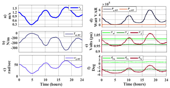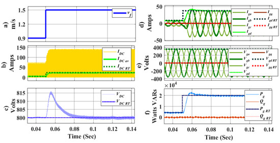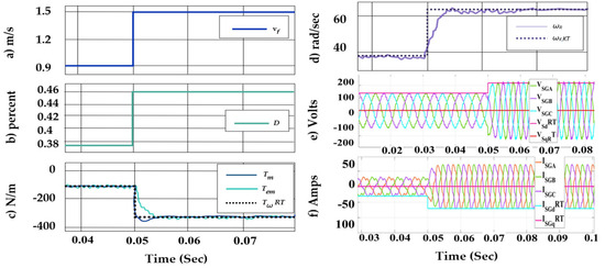 The behaviour of the mechanical () and electromagnetic () torques and mechanical speed () of the detailed model are contrasted with those obtained by the RT model, obtained from Equation (5), showing an adequate steady-state behaviour of both systems. Finally, in Figure 8e,f, there is an increase in the magnitude and frequency of the voltages VSGabc and currents ISGabc of the PMSG. These are represented in the dq-frame RT model, obtained from (6) and (7).