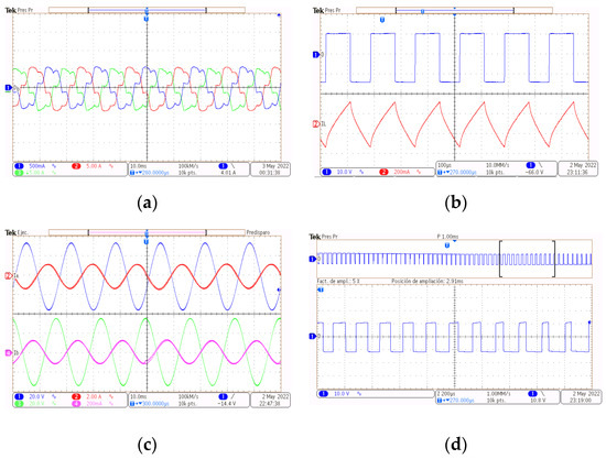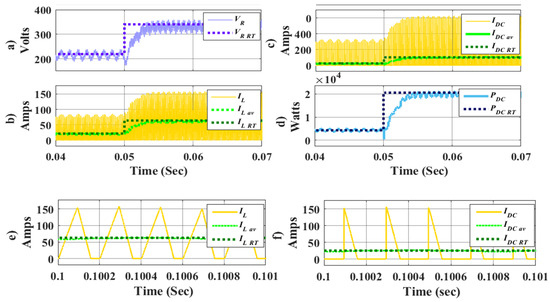Subsequently, the boost converter’s input current () is observed. This is shown averaged and compared to the current obtained in the RT model () from Equation (17). Additionally, the output current obtained in Equation (16) is shown. The voltage VDC is considered constant in steady state due to the regulation action of the VSC converter, with . The power at the DC port in the RT model is . Finally, Figure 9e,f display a zoomed view of the input and output waveforms of the PFC-Boost, which is consistent with the analysis in Figure 6b.