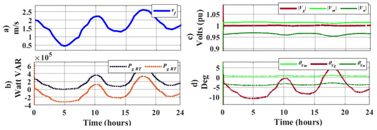 Effect of Volt/Var regulation control in Vg; (a) Aleatory Marine current; (b) Active and reactive powers (c) Nodal voltages (d) Angle Voltages.
