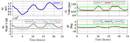 Effect of BESS integration; (a) Aleatory Marine current; (b) Active and reactive powers (c) Nodal voltages (d) Angle Voltages.