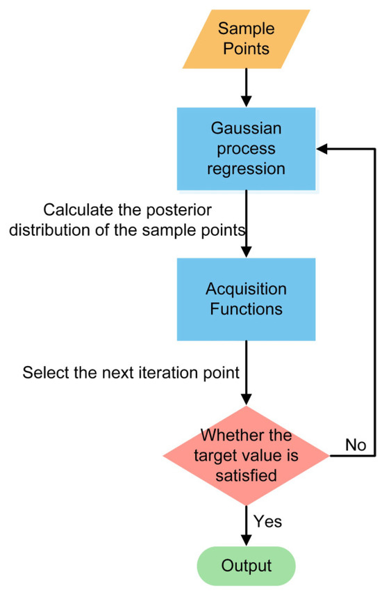 A brief flow of Bayesian optimization is illustrated in Figure 1. There are two core processes for Bayesian optimization. The first core process is the probabilistic proxy modeling, which is a model for computing the probability of an unknown objective function. In the Bayesian optimization process, the apprise of the probabilistic proxy model is accomplished by increasing the number of sample points and continuously correcting the prior probabilities [18]. One of the widely used probabilistic proxy models is the Gaussian process. Since a Gaussian process is a collection of stochastic variables obeying a normal allocation, the normal distribution obeyed by the next sampling point at any value can be estimated after calculation so that the next optimal sample point can be obtained by the sampling function. The hyperparametric optimization in this paper is based on the Gaussian process to achieve the objective function modeling. The second core process is the obtaining function, which is structured according to the posterior approximation of the probability distribution, and it can use the existing information to find the next sample point. The most important function of the sampling function is to equilibrate the search and utilization in Bayesian optimization and avoid Bayesian optimization falling into a local optimum [18].