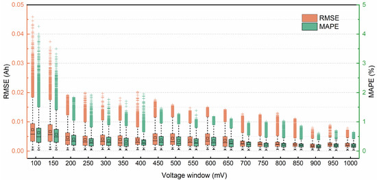In general, a wide window will decrease the global root-mean-square error, eliminate outliers, and shrink the spread of the error. In this paper, the effect of window length is investigated, i.e., with different input data lengths, the window size is varied from 100 mV to 1000 mV in steps of 50 mV, and the results are shown in Figure 5. When the window size is more than 300 mV, the improvement of accuracy is limited by increasing the window size, even though the overall RMSE is reduced. Moreover, as the voltage window length increases it also leads to an increase in the input sequence sampling time.