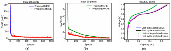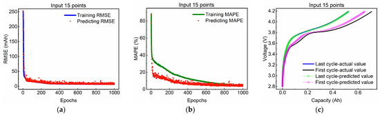 Based on Reference [22], we first considered the charging profile prediction for an input strength of 300 mV (number of input elements is 30). The results suggest that the model could accurately predict the complete charging curve with an RMSE of less than 19.3 mAh (2.608% of the nominal capacity of 0.74 Ah) and MAPE is less than 1.77%. In order to intuitively examine the estimated results, the optimal charging curves for the first and last cycles of the test dataset were also plotted. As can be seen in Figure 4, the evaluation results are in accordance with the input starting voltage over the entire cell voltage spectrum.