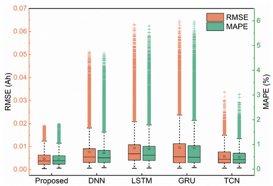 To demonstrate the capability of the proposed method, four intelligent learning techniques are used as baseline methods, namely general deep neural networks (DNN), long and short-term memory (LSTM), gated recurrent units (GRU), and time-domain convolutional networks (TCN). Each method uses the same 20-point input data as the proposed method. Their estimation error distributions are shown in Figure 10. It can be noticed that the common DNN, LSTM, and GRU cannot provide reliable estimation compared to the proposed method, where the maximum MAPE of LSTM and GRU is more than 5%. While TCN has better prediction performance, the maximum MAPE still reaches 3%. In summary, the proposed method can reliably and accurately predict the overall charging curve using 20 points of input data.
