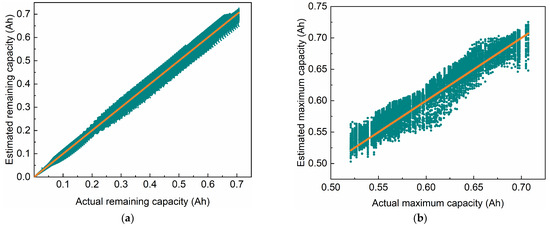 Estimation compared to actual values for voltage window of 200 mV: (a) remaining capacity; (b) maximum capacity.