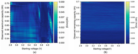 The estimation error of capacity for voltage window of 200 mV: (a) maximum capacity error; (b) remaining capacity error.