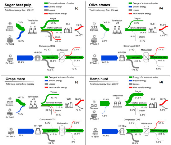 Altogether, global exergetic efficiencies also show a fair variability with respect to the biomass fed. OS stands out as the most efficient biomass option, with an exergetic efficiency of 60%. GM follows the chart (57%), followed by SBP (51%) and HH (45%). When considering also torgas valorization, HH becomes instead the preferable option (77%), followed by OS (70%), GM (69%), and SBP (67%). In the scenario without torgas valorization, global efficiencies are less uniform when varying the biomass type, which is due to a corresponding higher variability in the torrefaction efficiency. In general, the efficiency of the torrefaction unit shows the highest degree of variability, a phenomenon that will be further elucidated after the introduction of the Sankey diagrams. Moreover, the introduction of Sankey diagrams makes it easier to understand where the irreversibilities of the process are nested.
