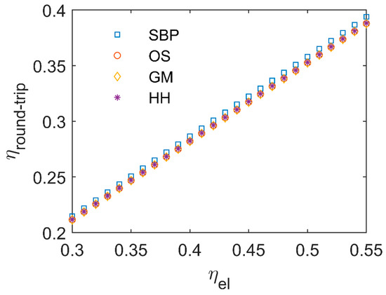 Round-trip efficiency as a function of the electric conversion efficiency.