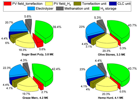 Figure 5 shows the total plant costs, and their breakdown in the main plant sub-sections, for the four biomasses in a fixed site location (base case scenario). It is observed that, in all the cases, the H2 temporary storage vessel is the most expensive equipment (39–44% of the total plant costs), followed by the electrolysis system (21–23% of total plant costs), and the PV field for the H2 production (18–20% of the total plant costs). The methanation, chemical looping, and torrefaction units each account for about 3–6% of the total plant costs. The cost of the PV field for the torrefaction process is almost negligible for OS and HH, which feature a very low moisture content (<15%wt), but it accounts for 3–6% of the total plant costs for SBP and GM, which feature instead a much higher water content (>50%wt), in agreement with the exergetic analysis discussed before. Altogether, the total plant costs range within 3.3–4.2 M€ for the considered site location: lower values are obtained for the biomasses with a lower content of fixed C and moisture, and vice versa. Indeed, the fixed C fraction determines the amount of CO2 produced, hence the H2 required, whose production directly affects the investment cost of the PV field, electrolyzer, and methanation unit. The moisture content, instead, affects the cost of the torrefaction unit, and of the PV field as well, because of the energy required by the torrefaction process. It should, however, be underlined that for biomasses that produce more CO2, despite larger investment costs, a higher amount of synthetic natural gas will be produced eventually.