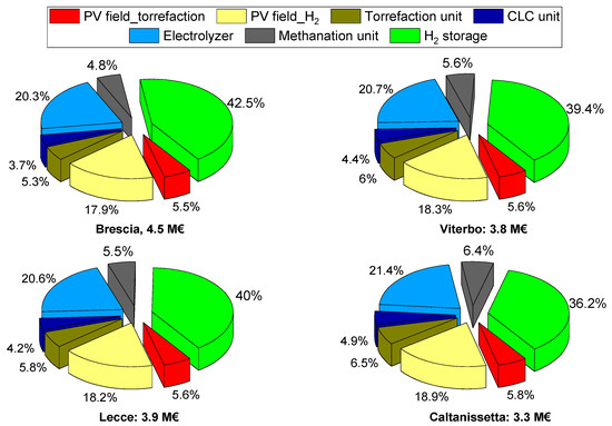 Figure 6 shows the same data as Figure 5 but varying the site location for the same biomass (SBP). It is observed that the total plant costs decrease from about 4.5 M€ to about 3.3 M€ when moving from the north of Italy (Brescia) to the south of Italy (Caltanissetta). The trend clearly arises from the higher solar irradiation that characterizes the south of Italy, as inferable from the analysis of Figure 2. In particular, both the higher solar irradiation and its slightly lower fluctuation over the different months of the year, strongly reduce the cost of the PV field, electrolyzer, and H2 temporary storage tank.