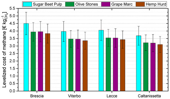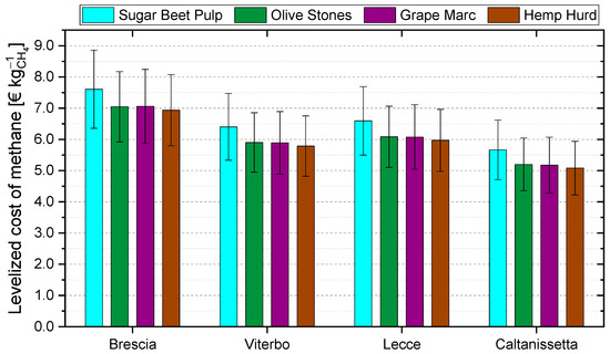 - Regardless of the site location, the use of SBP returns the highest levelized costs of methane. Values reduce by about 0.5–0.6 € kgCH4−1 when considering the other biomasses;