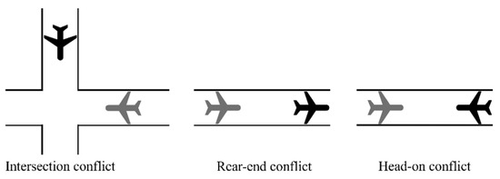 Aircraft taxiing is the primary form of fuel consumption during ground operations, and aviation fuel combustion generates large amounts of CO2, hydrocarbons (HCs), CO, NOX, SO2, and other pollutant gases. In addition, ground taxiing conflicts include intersection conflicts, rear-end conflicts, and head-on conflicts (as shown in Figure 1), which will reduce the efficiency and safety of ground operations, and increase the fuel consumption. Therefore, taxiing conflicts should be avoided as much as possible in the taxiing scheme.
