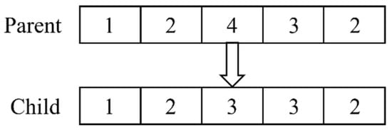 (5) Mutation operation: Single-point mutation is adopted. For the mutation probability of each chromosome Pm, one gene value on the chromosome is randomly changed, and the new gene value is another available path number of the flight, as shown in Figure 3. The parental chromosome undergoes a mutation operation on flight 3, which changes from the original taxiing path 4 to taxiing path 3.