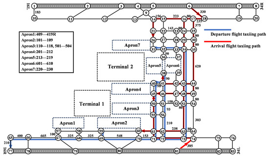 The optimal taxi paths for the arriving and departing flights are shown in Figure 5. The blue lines represent the taxiing paths of the departing flights, and the red lines represent the taxiing paths of the arriving flights. The figure shows that some departing aircraft taxiing from apron 4 chose the second shortest path to avoid taxiing conflicts. This cannot be achieved by shortest path search algorithms, such as the Dijkstra algorithm.