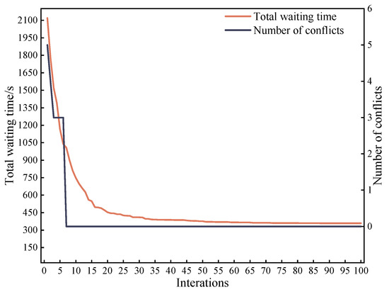 Figure 7 shows the iteration curves of the waiting time and the number of taxiing conflicts for the optimal solution of the lower-level model. By transmitting the optimal solution of the bilevel model, the total waiting time and taxiing conflicts were effectively reduced. The lower-level model accepted the optimized taxiing scheme from the upper-level model and optimized the taxiing start time of each flight based on the current optimal taxiing scheme. To avoid the occurrence of taxiing conflicts, the lower-level model’s optimization objective function also includes a taxiing conflict penalty factor that causes the objective function value to decrease rapidly at the beginning of each iteration. After seven overall iterations, the number of conflicts for the optimal taxiing scheme was reduced to 0 and converged. After 87 overall iterations, the waiting time was minimized and converged. The final total waiting time was 359 s.