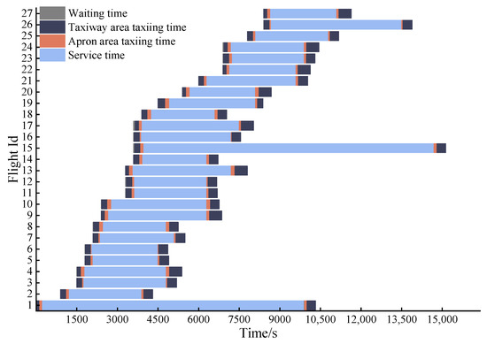 Figure 8 shows the Gantt chart of the optimal taxiing scheme for arriving and departing flights. It includes the ground operations processes of the flights from landing to takeoff: waiting times for arriving and departing flights, taxiing times on the apron and taxiway areas, and service times. To avoid taxiing conflicts and improve the operation efficiency of the surface, some arriving and departing flights adopted the waiting taxiing strategy. The total waiting time for the arriving flights was 342 s, and the total waiting time for the departing flights was 17 s.