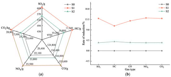 Equations (14) and (15) can be used to obtain various gas emissions of the optimal taxiing scheme under each group. Since it is not possible to quantitatively analyze the relationship between the number of taxiing conflicts and aviation fuel consumption, gas emissions were calculated without considering the S3 control group. The results are shown in Figure 10, where (a) is the gas emissions of each group and (b) is the reduction rate of the experimental group compared to the control group.