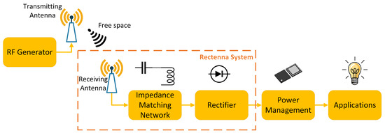A typical radio frequency (RF) WPT system structure (Figure 1) comprises a transmitting antenna and a rectenna system with the following three essential components: a receiving antenna, a impedance-matching network circuit, and a rectifier circuit. At the receiving end of a microwave WPT system, the antenna captures radiated RF signals from a transmission station, converting them into alternating current (AC) voltage. The matching circuit, consisting of inductor–capacitor (LC) components or microstrip transmission lines, is designed to ensure that the maximum power is transferred to the associated rectifier. The rectifying circuit then converts the microwave power, which is difficult to use directly, into direct current (DC) voltage output, supplying electric power to the connected load. The performance of the rectifier determines the capabilities of the entire power transfer system in numerous applications.
