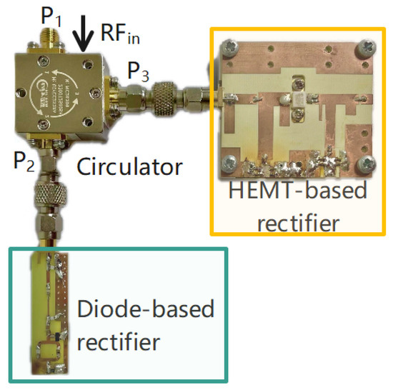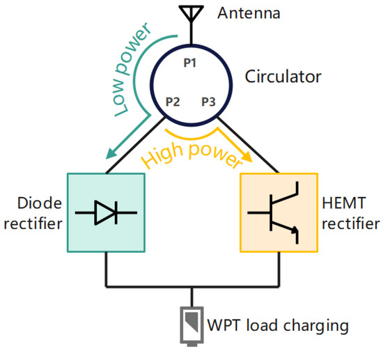 Therefore, the incident RF signal can be transferred from P1 to P2 to the diode-based rectifier so that S21 is 1 and all other S-parameter values are 0, which means they are fully isolated. The diode-based rectifier sustains its function of DC generation at a low input power level. When deliberately exposed to excess power, the circulator redirects the reflected power to another appropriately matched high-power HEMT-based rectifier, where S32 is 1. Therefore, high efficiency can be achieved at different input power levels for WPT applications.