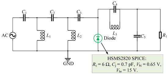 Diagram of the low-power, diode-based rectifier circuit with SPICE parameters. The SPICE parameters of the diode consist of the series resistance (), the junction capacitance (), the built-involtage (), and the breakdown voltage ().