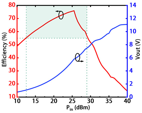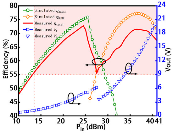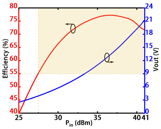 The measured rectification efficiency and output DC voltage versus input power are shown in Figure 14. When the input power is 41 dBm (12.6 W) and the gate DC bias is −3.8 V, the measured output DC voltage is 20.87 V, and the rectification efficiency is 68%. The maximum efficiency of 72.8% (diode-based) is recorded for a 24.5 dBm (0.28 W) power input, with an efficiency of 71.5% (HEMT-based) for a 36.5 dBm (4.46 W) power input. Consequently, the rectifier’s operating mode is determined by the input power level, enabling a 27.5 dB (from 13.5 to 41 dBm) ultrawide dynamic range with over 55% conversion efficiency.